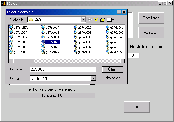 Die Angabe der Datenfiles über eine Dateiliste (Bild) ermöglicht, Dateien aus verschiedenen Verzeichnissen gemeinsam zu plotten. Zudem kann man eine Liste dieser Dateien als Text importieren, so dass diese Zusammenstellung nicht ständig neu eingetippt werden muß. Ein weiterere Möglichkeit zum Editieren der Dateiliste bietet die interaktive Anwahl von Dateien über