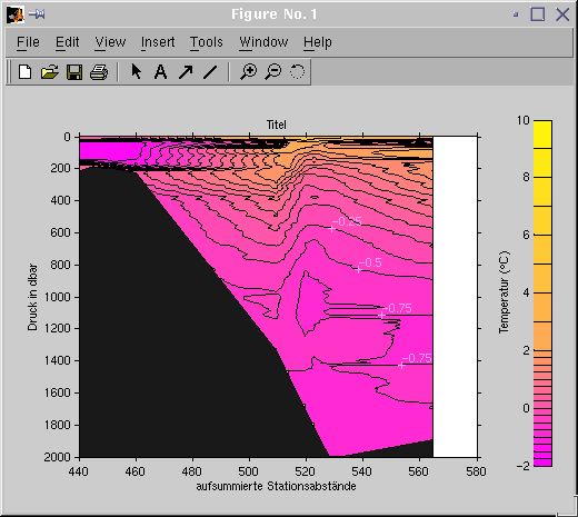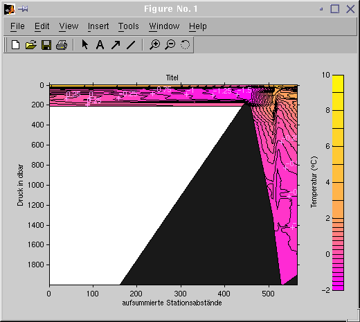 ab. Es erscheint dann der Schnitt und man kann mit Hilfe der Maus die Positionen der Isolinienbeschriftungen festlegen. Der Abbruch hiervon erfolgt durch Auswahl eines Punktes ausserhalb des Rahmens (aber noch innerhalb des Plotfensters) oder durch ein [Return] während das Matlab-Fenster aktiv ist. Anschließend wird im Falle eines Schnittes noch die Topographie gemalt und die Darstellung ist fertig.