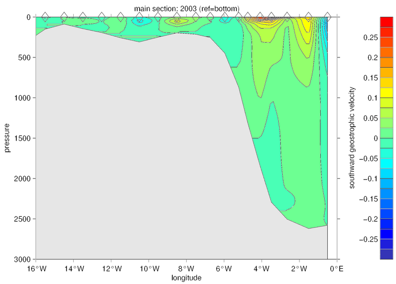 The temperature and conductivity sensors of the CTD are routinely calibrated (Table 1). During data processing the pre-cruise calibration was used. The change between pre- and post-cruise calibration in temperature was smaller then 0.2*10-3 °C and therefore no further correction was applied. The drift of the conductivity sensor is so large (up to 0.009 mS/cm, see Figure 1) that it has to be taken into account. One reason for this large drift can be, that the sensor got a new conductivity cell in March 2003. The drift correction was done by fitting a polynom of 3rd order to the difference in pre- and post-cruise calibration. The CTD conductivity was then corrected using 6/8 of fitted difference. The factor 6/8 was used because the cruise took part about 6 months after the pre-cruise calibration and the time between calibrations was about 8 months. Salinity samples were taken on the cruise for latter processing on land. This processing was delayed and was done only some months later. Due to the longer storage the precision is probable not as high as if done directly after the cruise. A final calibration including the salinity samples is still not done.