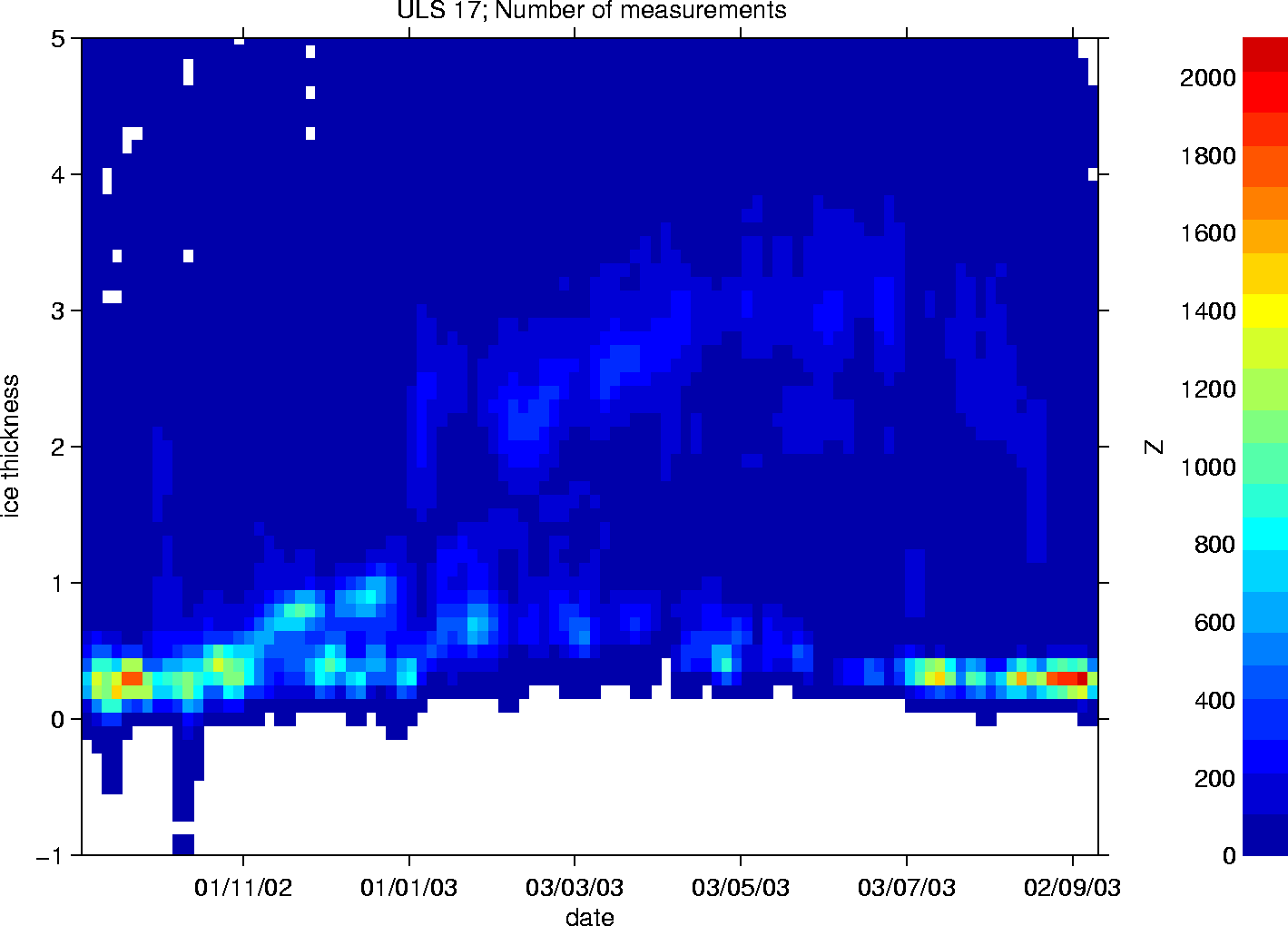 A new method for the calculation of ice thickness is being developed at the NPI. High quality data of ice thickness from the ULS data will therefore not be available before 2005. But the ULS data is available once the new method is established and has also the potential as can be seen in a preliminary, rough estimate of the ice thickness (Figure6). This rough calculations used just one of the four available travel time measurements, did not take into account the signal envelope and used just the mean sea level pressure from the NCEP reanalysis with 2.5° spatial and 6 hour temporal resolution. But even so the increase of ice thickness during winter, mostly open water in Summer 2003, and other features are visible.