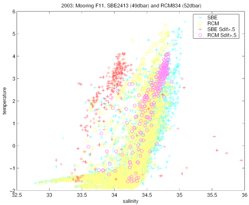 These salinity problems can both be seen in the instrument pair RCM 843 and SBE 2413 on mooring F11. The uncorrected RCM salinities were much to high. A comparison with the Microcat 2413 above showed a conductivity offset of about 0.5 mS/cm and a small temporal trend. After this correction the RCM and Microcat salinity is very similar for most times, but during some periods SBE 2413 shows much smaller salinities (Figure 4). We can exclude a strong gradient exactly in between both instruments, because during a time of lower salinities the instruments itself made vertical excursions of more then 50dbar. We therefore assume some dirt in the Microcat sensor. No such problems are noticeable in the instrument pair RCM 836 SBE 1253 after correction of the conductivity offset (0.85) and drift.