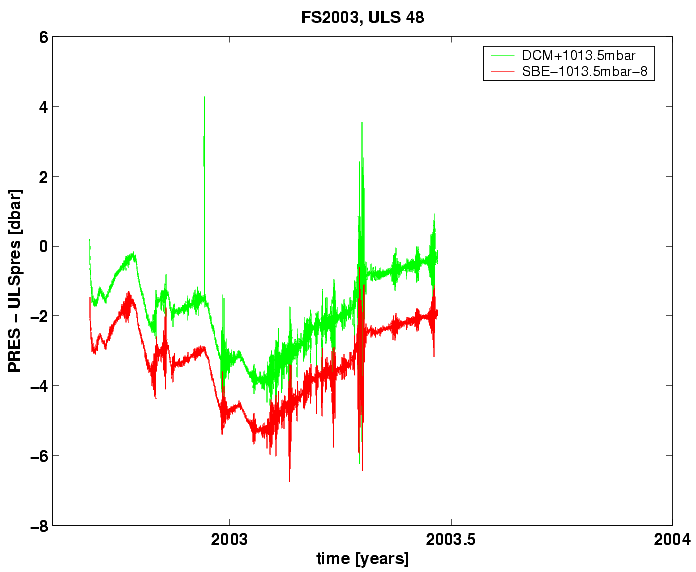 Both recovered ULS had problems with the pressure sensor. This can clearly seen by comparing with other instruments nearby. For the ULS 17 this is the Microcat 1253; for the ULS 48 it is the DCM 17 and the Microcat 2414. The ULS record total pressure while the Microcat and DCM measure pressure relative to the mean atmospheric pressure. This is corrected by adding a standard atmospheric pressure of 1013.5mbar onto the Microcat and DCM data. The Microcat is not at the same depth, but as the depth difference is small the pressure should behave similar to the ULS. While the temporal evolution of the DCM and Microcat pressure, apart from an offset due to vertical instrument separation, is almost identical, the pressure from the ULS differs. The pressure difference between ULS and the two other instruments is a non linear function in time (Figure 5). No simple correlation of the pressure difference with temperature or pressure could be found.